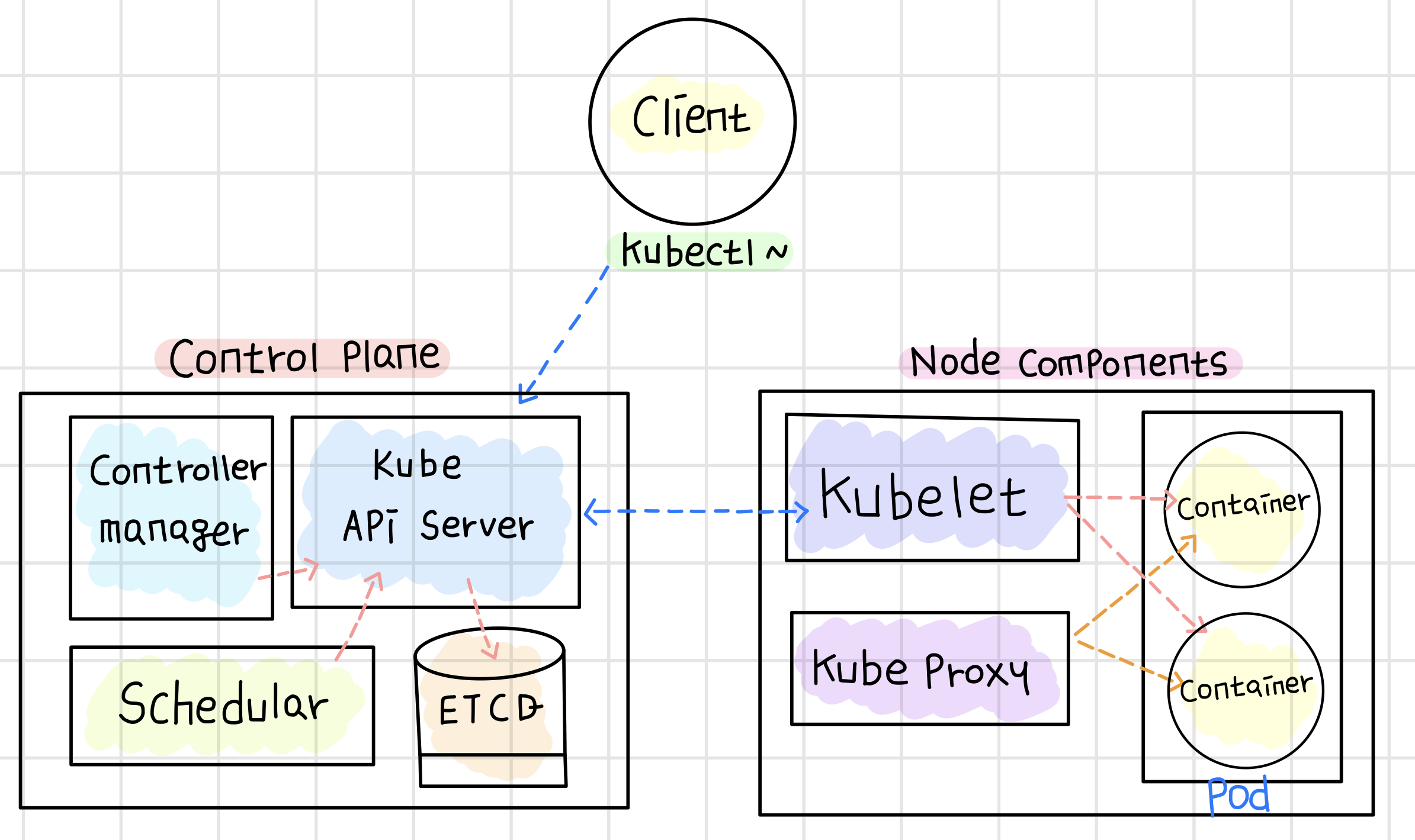 - Node Coponents(Worker Node): 동작 중인 Pod를 유지시키고 K8S 런타임 환경을 제공하며 관리를 위해 필요한 요소들