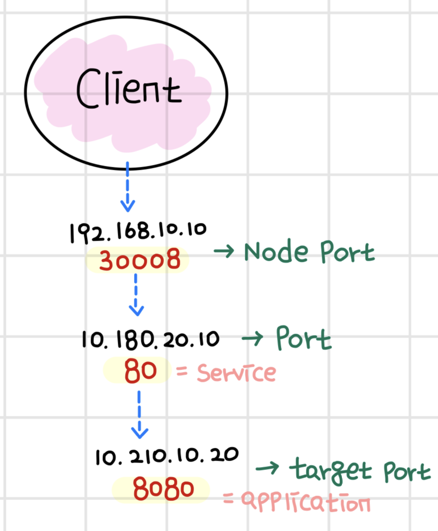- targetPort: Pod의 Application에 오픈된 Port를 의미하며, 서비스를 통해 들어온 프래픽은 Pod의 <내부 IP>:<target port>로 통신됨.