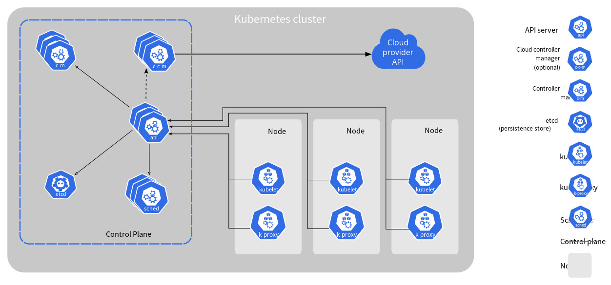 - Control Plane(Master Node): 클러스터에 관련된 전반적인 기능을 제어하는 역할(ex. 스케쥴링, 모니터링 등)을 수행한다. Control Plane은 실제 서비스와 무관하고 쿠버네티스 클러스터 운영에 관련된 컴포넌트들로 구성되어있다.