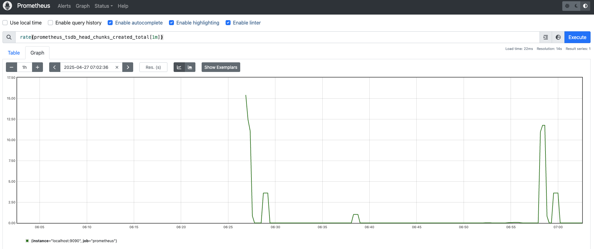 localhost:9090/graph에서 Graph 탭에서 그래프를 볼 수 있다.
