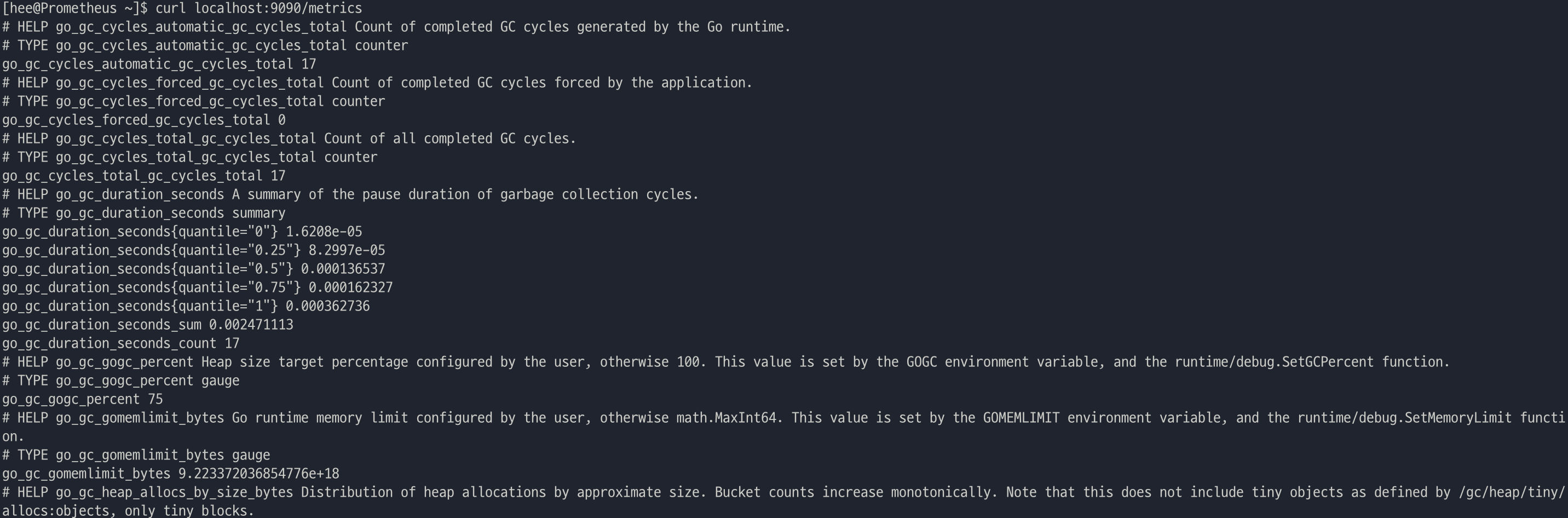 터미널에서 localhost:9090/metrics로 curl을 날리면, 수 많은 메트릭 정보들을 볼 수 있다.