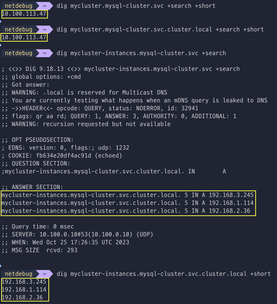 도메인 주소로 접근 시 MySQL 라우터를 통해 Pod로 접속되며, Headless 서비스 주소로 개별 Pod로 접속하기 위하여 DNS쿼리를 실행했다.