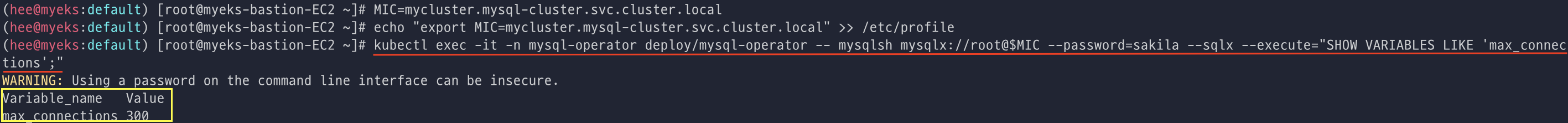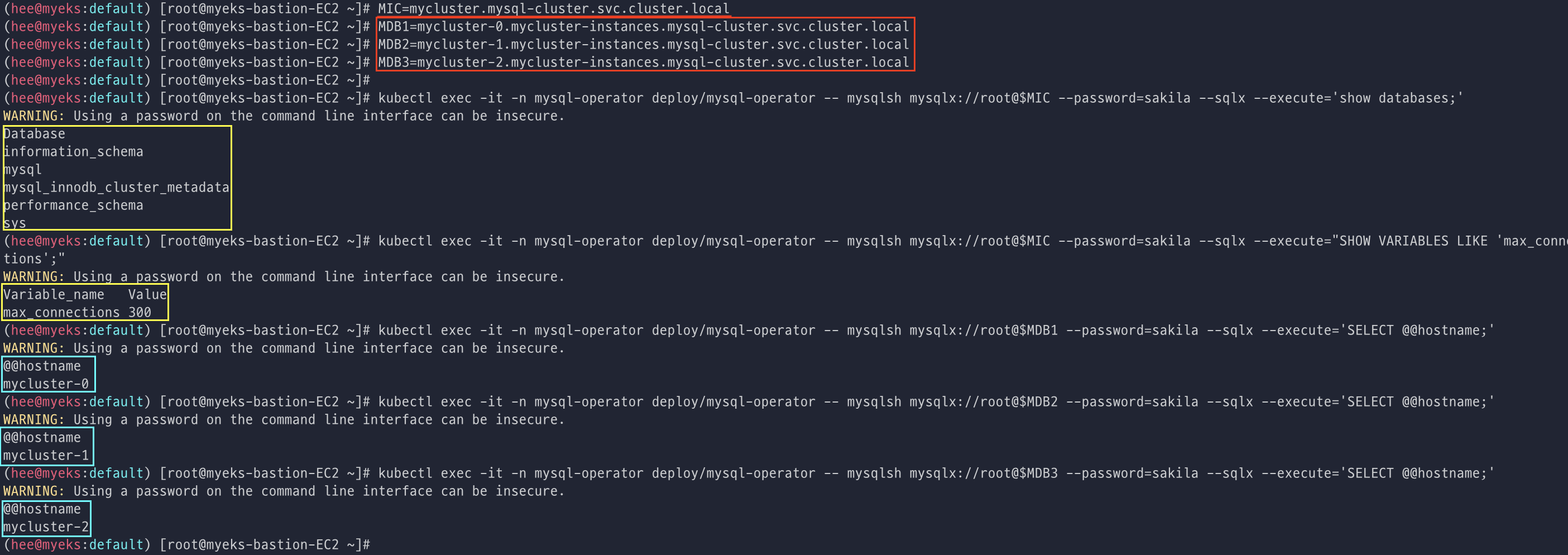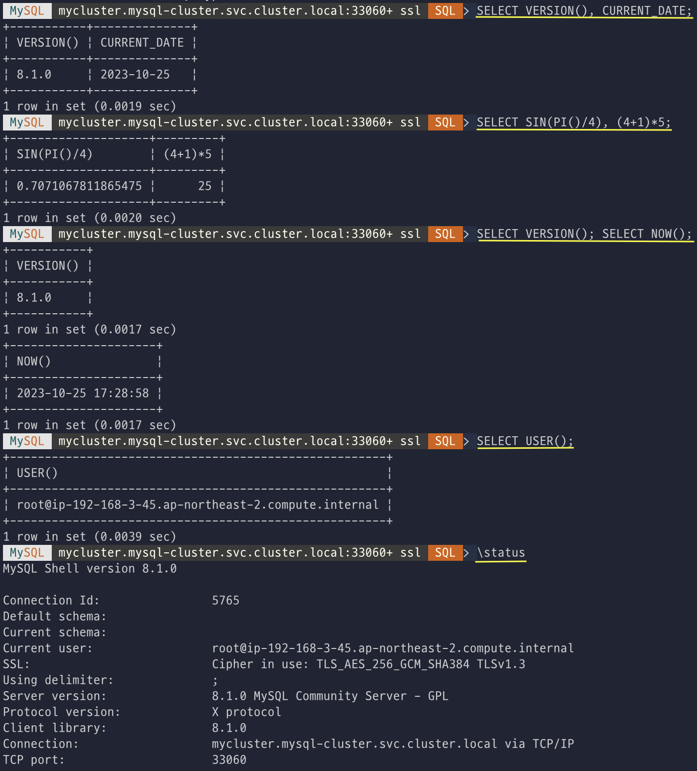kubectl exec -it -n mysql-operator deploy/mysql-operator -- mysqlsh mysqlx://root@$MIC --password=sakila --sqlx