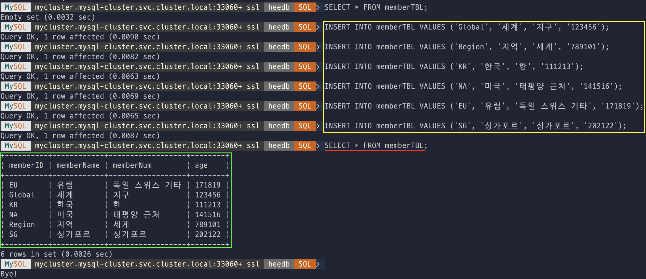 접속 주소 변수를 지정해주고, MySQL 라우터를 통해 Pod 접속해보고, 개별 Pod로도 접속을 해봤다.