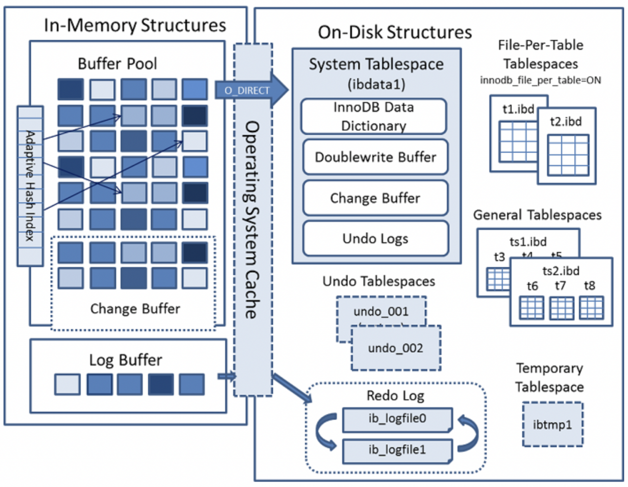 - Inno DB는 In-memory 구조로, 데이터와 인덱스를 메모리에 캐싱하기 위한 버퍼 풀이라는 저장 영역을 유지 및 관리